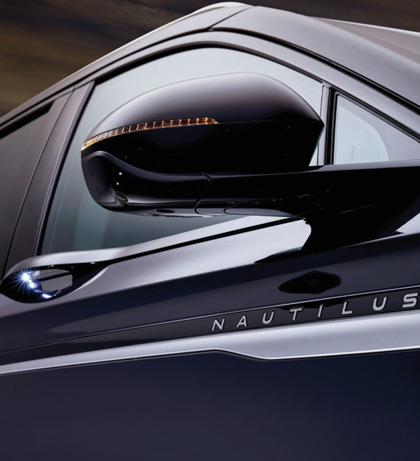 측면은 헤드램프 끝상단에서 시작된 후드파팅라인이 자연스럽게 수평에 가까운 케릭터라인과 연결되고 차량 끝부분 까지 이어져 링컨의 시그니처인 수평적 디자인을 잘표현하였고, 케릭터라인 바로 아래에는 블랙&크롬 투톤의 장식이 앞휀더에서 시작되어 앞쪽 도어끝단까지 연결되어있으며 차명인 노틸러스가 각인되어있습니다. 이는 어떤 차량에서도 보기 힘든 과감한 디테일이라고 할 수 있다.