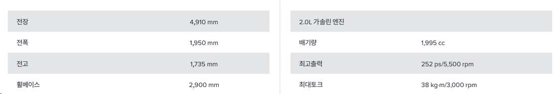 엔진 은 휘발류 2.0 터보를 장착하여 252마력/38kg 토크를 발휘하며 SUV로서 준수한 달리성능을 보여줍니다.