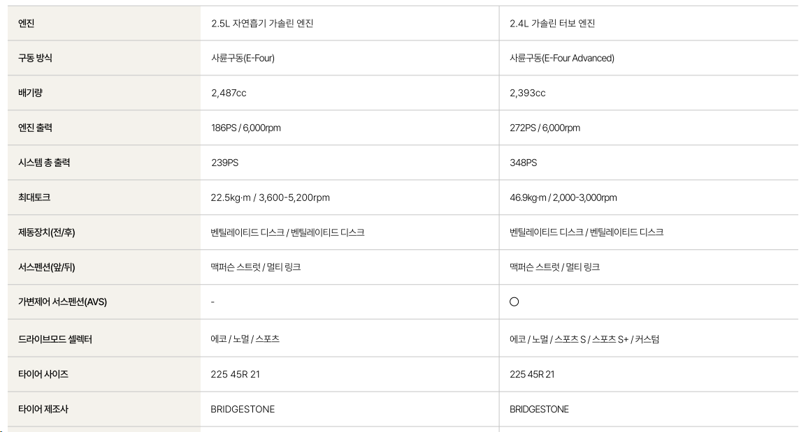 2.4L 자연흡기엔진기반 하이브리드 시스템에 터보를 추가하였고, 보다 높은 성능의 4륜 시스템을 위한 배터리와 냉각장치까지 더해져 기본 하이브리드 모델보다 월등히 높은 시스템합산출력 348hp / 46.9kg.m 을 갖게되었습니다.
